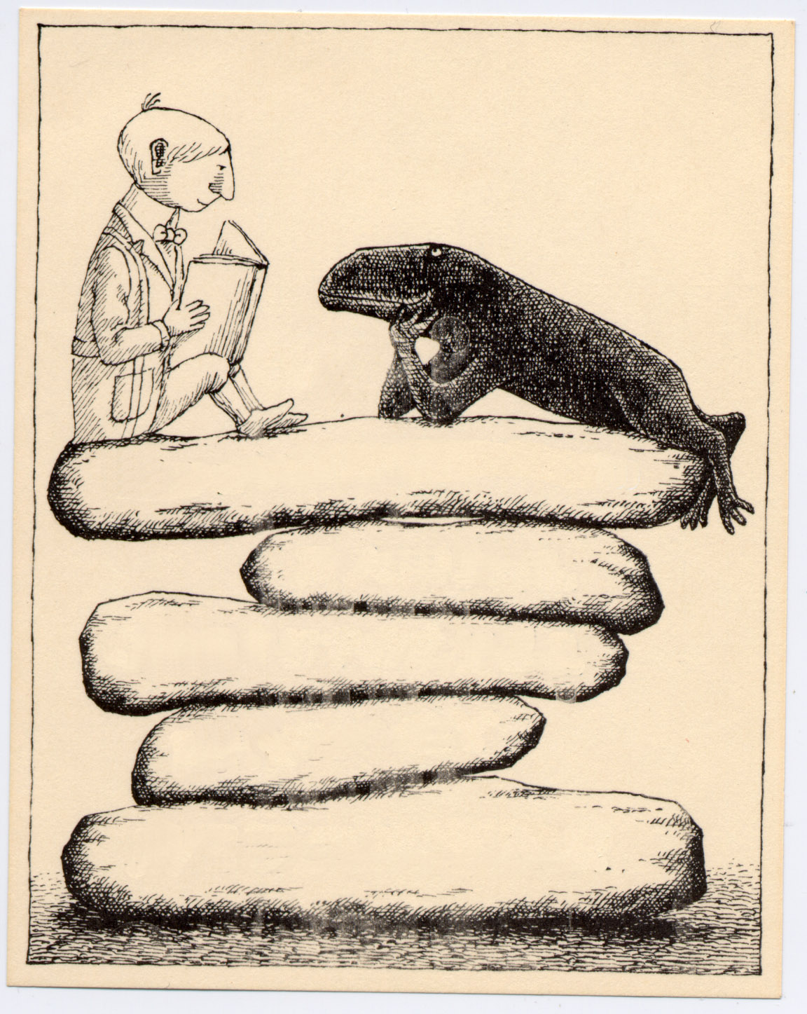 L’autre papa du Stoejgnpf est Edward Gorey, l’illustrateur des aventures de Donald, le grand ami de Peter. Voyez ici le portrait qu’il a fait de l’animal regardant Donald lire un livre.