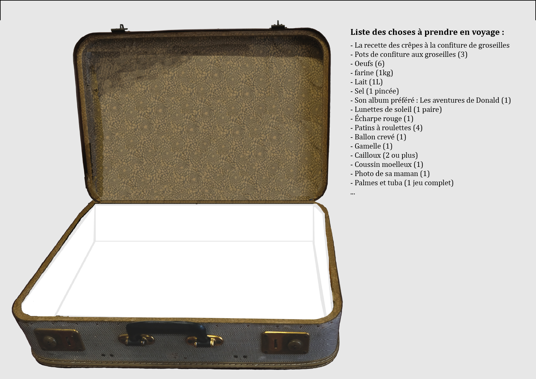 Voici sa valise et la liste de tout ce qu’il doit emmener avec lui. Pourriez-vous l’aider à remplir sa valise ? Espérons qu’il y ait assez de place ! Téléchargez la valise du Stoejgnpf.